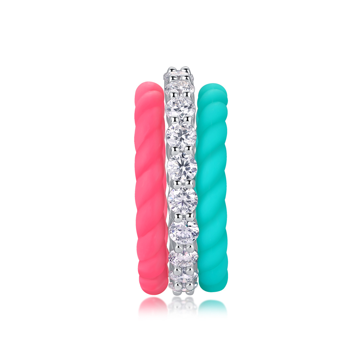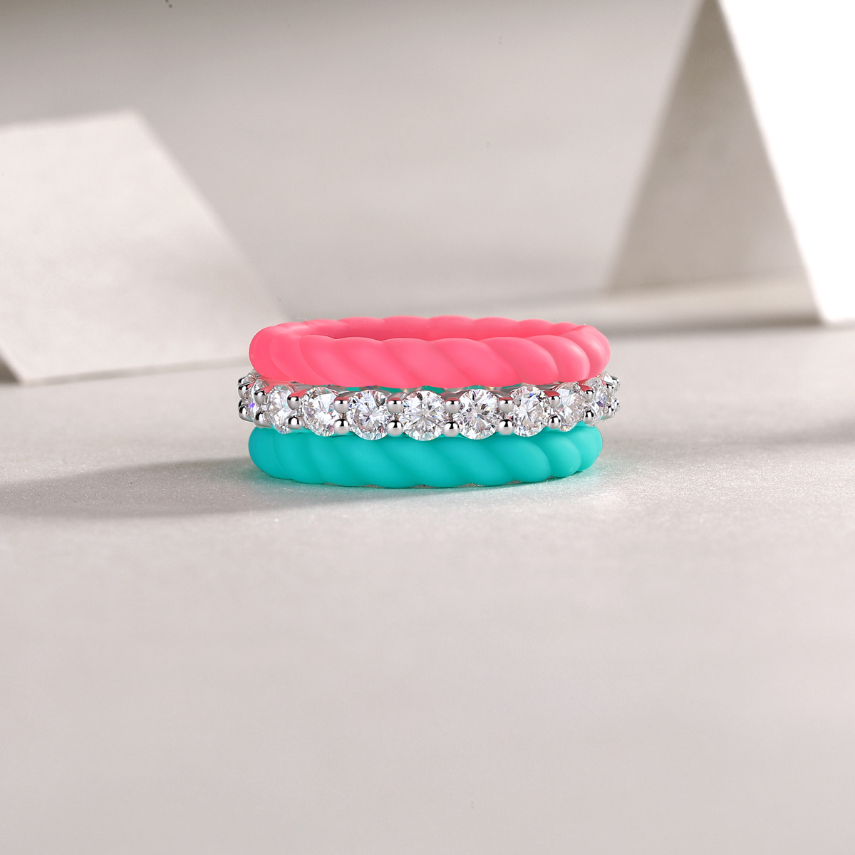 Experience the versatility of the Moissanite Eternity Band by Gufumart. This unique 3-piece set features a shimmering Moissanite eternity ring paired with two colorful, textured guard bands.