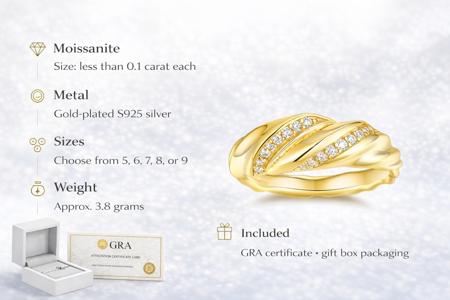 Crafted from premium S925 Sterling Silver and electroplated with a thick layer of gold, The Solis™ is built to last. Each tiny Moissanite stone is meticulously set to ensure maximum light reflection, backed by a GRA certificate to guarantee authenticity and brilliance.