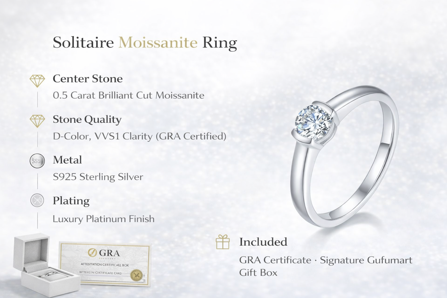 | Center Stone | 0.5 Carat Brilliant Cut Moissanite |